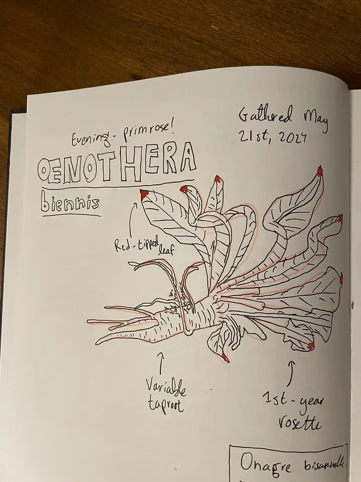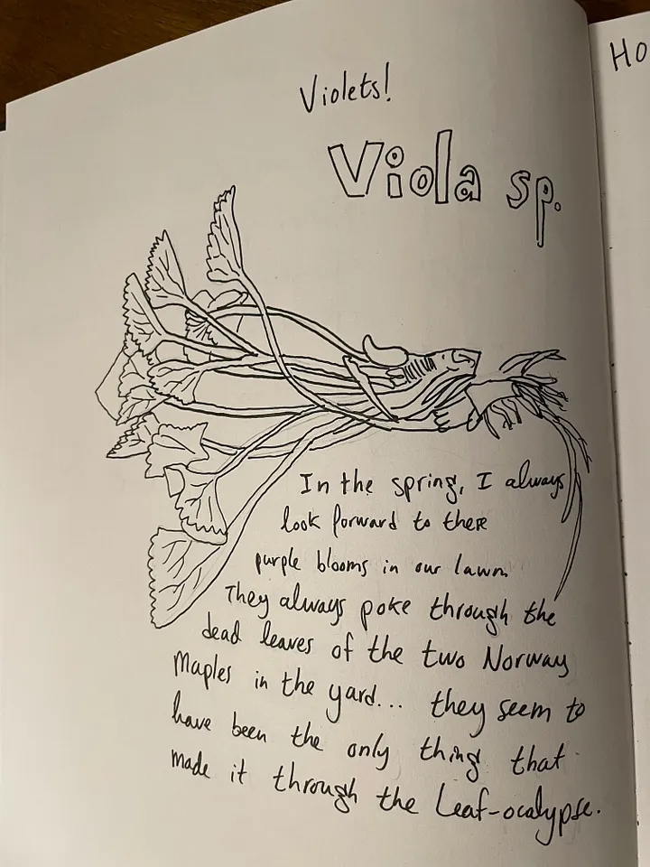 Two journal pages of some ubiquitous native lawn denizens : Common evening-primrose (Oenothera biennis) and violets (Viola sp.)